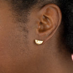 These gold half moon stud earrings are the perfect pairing of elegance and playfulness. Featuring a thick, durable layer of 14k gold alongside hand-marbled, colorful clay meant to mimic gemstone, these studs are lightweight and will make a statement piece. Each item is individually handmade, so slight variations will occur from piece to piece - that's the magic of these unique studs!