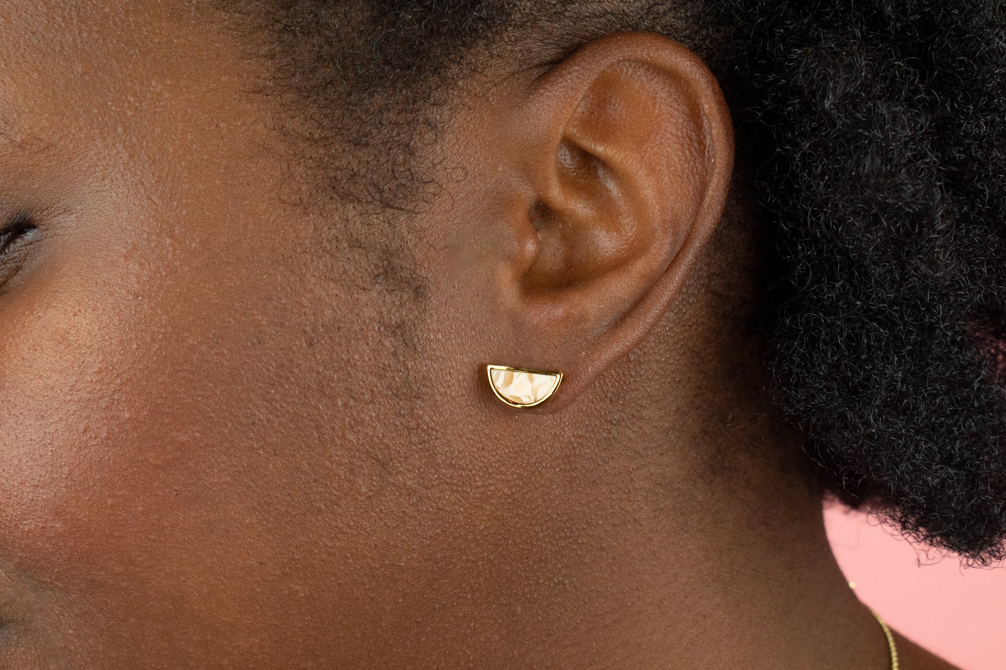 The perfect everyday stud. These 14k gold plated studs are ideal for regular wear, because the mix of pure gold and alloyed metal makes them more durable than soft 24k gold. They are a great choice for both a traditional lobe piercing and a second hole piercing making them super versatile.