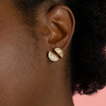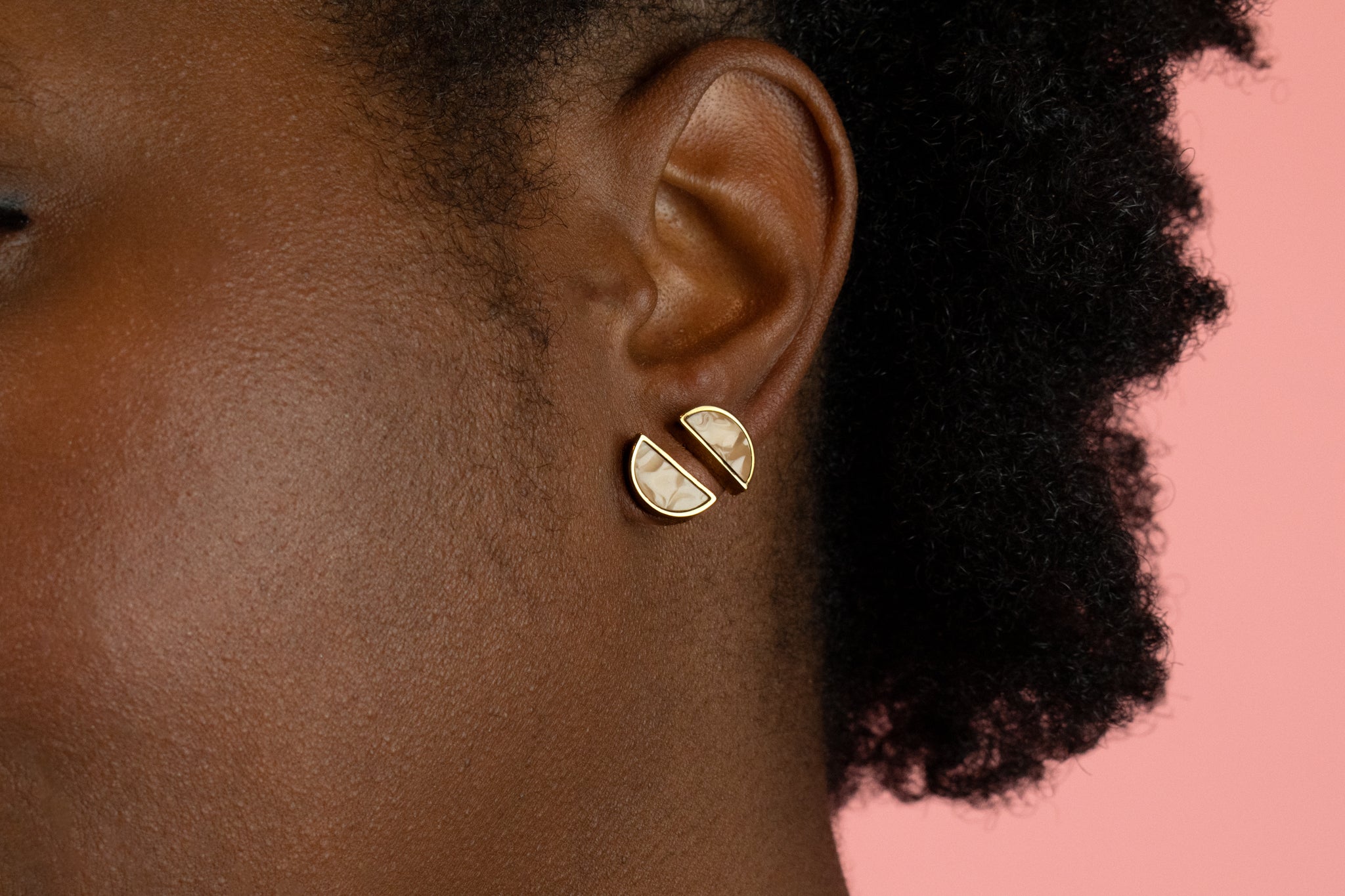 This geometric stud earring set in crystal quartz clay is made for easy accessorizing. Made with layered clay in creamy ivory and white clay flecked with gold, these shimmery neutral studs are perfect for everyday.