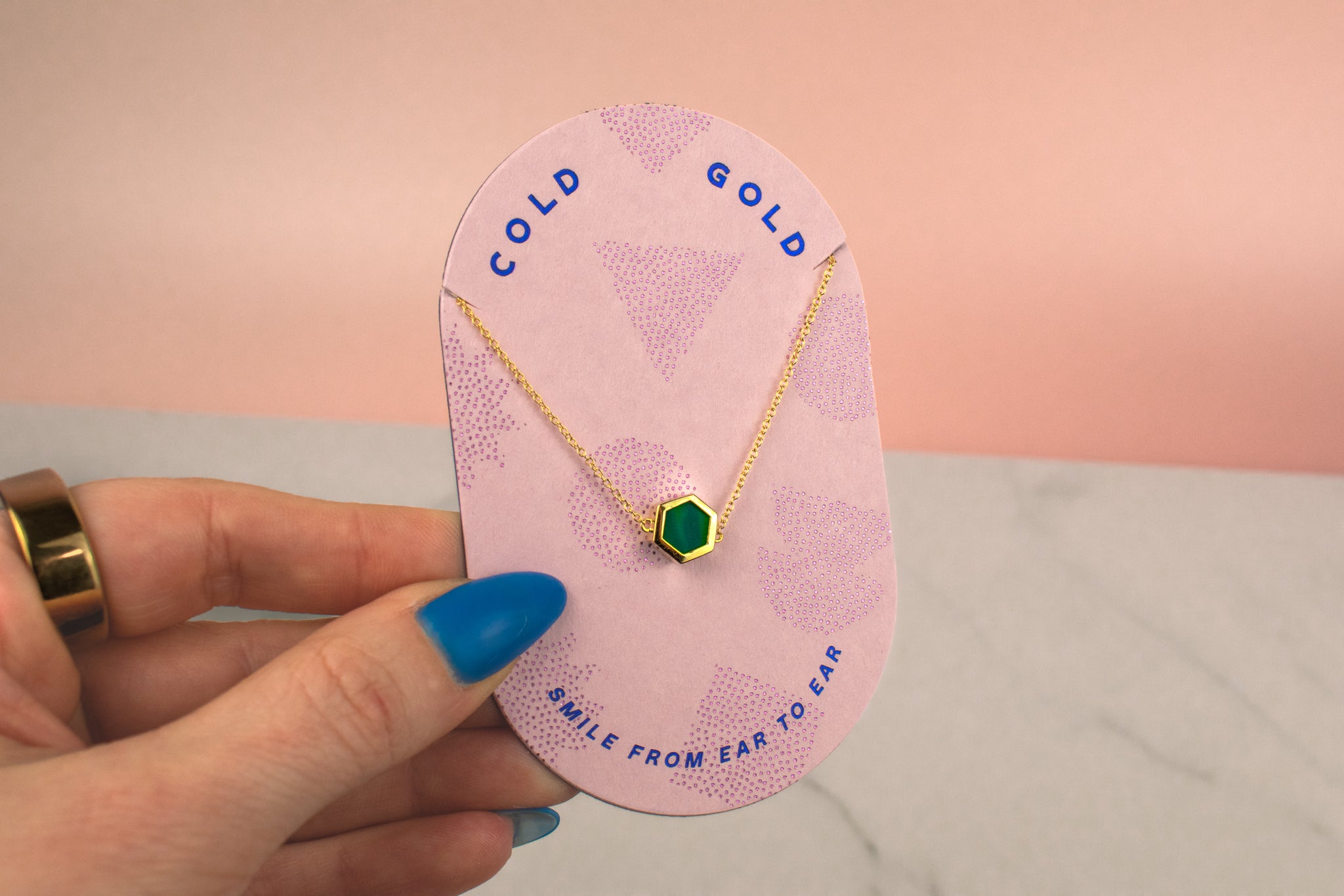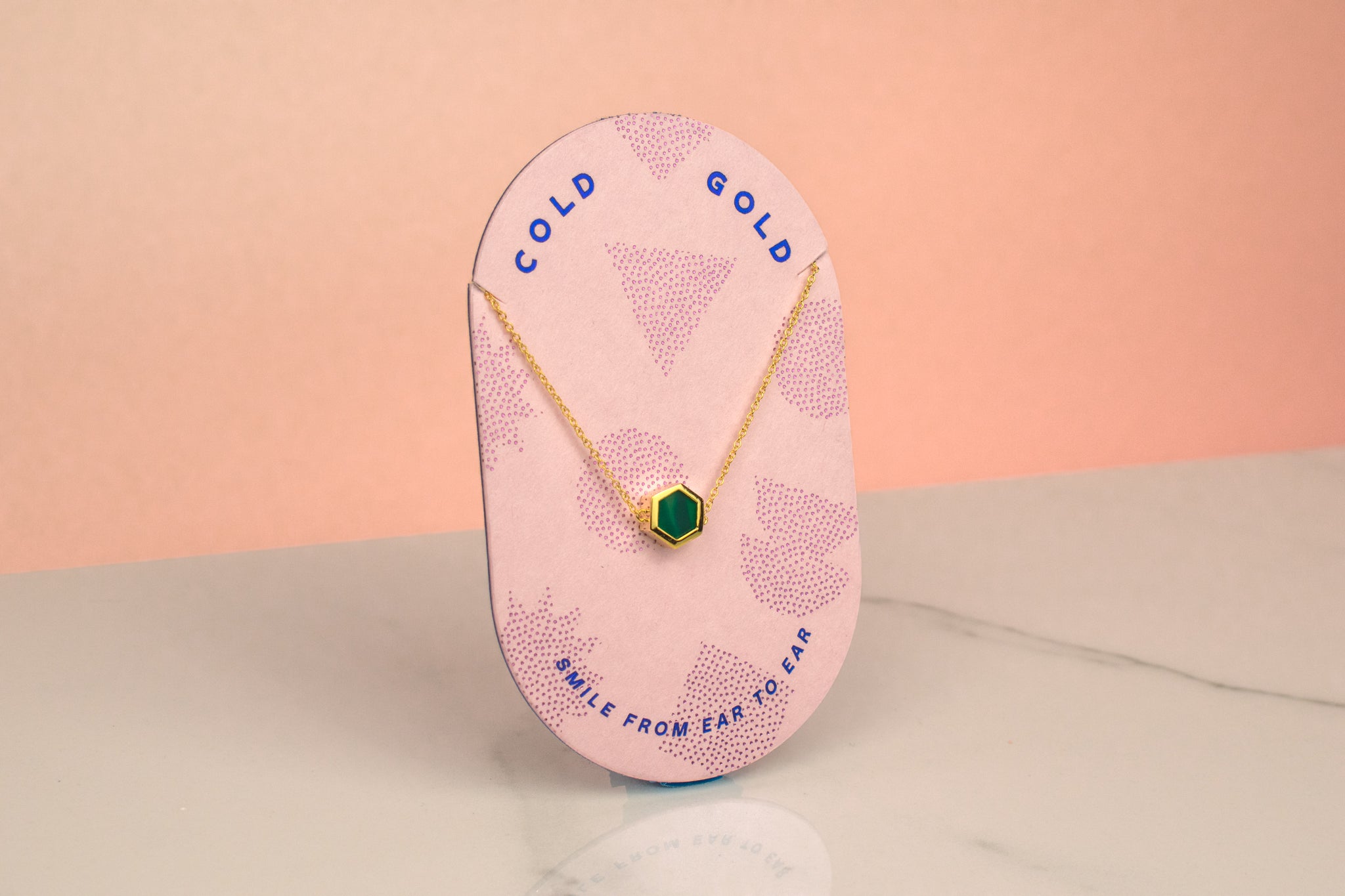 Classic and simple, this minimal gold hexagon necklace never goes out of style. It’s so dainty and lightweight, you’ll forget you have it on. Don’t let that fool you - it’s built to last through showers, swimming, workouts, and more. Featuring 14k gold plating and hand marbled clay meant to mimic gemstone, this necklace will add polish to maximalist outfits and glamor to simpler ‘fits. This short hexagon necklace in 14k gold and emerald marbled clay is pure quiet luxury. The cable chain is adjustable, so you can wear it at many lengths or even stack multiple necklaces for a layered look. Elevate your everyday with this simple gold necklace.