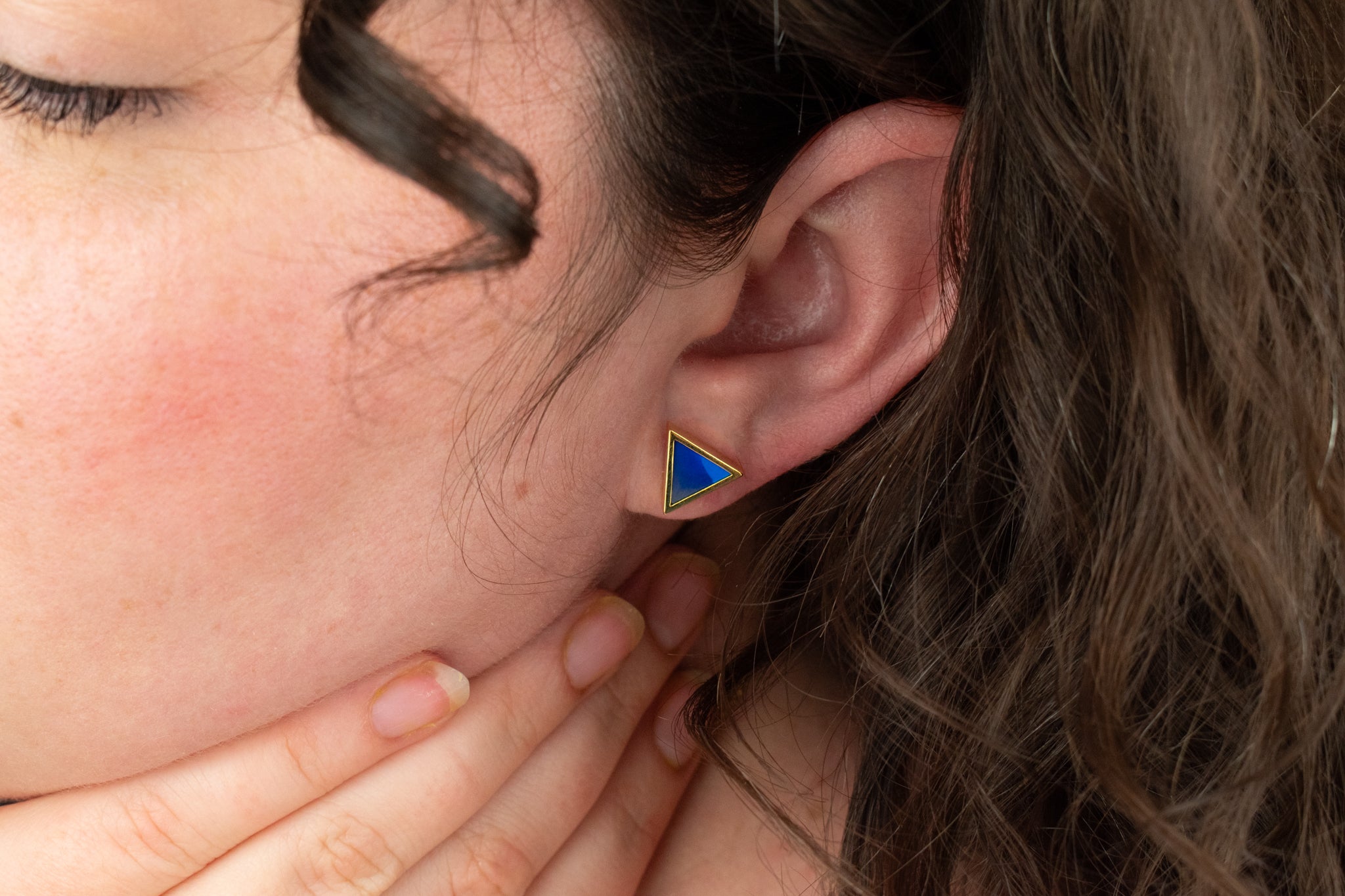 Deep and moody, these geometric earrings in sapphire bring the drama to an outfit. The blue clay is marbled by hand to create deep, rich jewel toned earrings. With transparent navy and bright cobalt, these studs mimic natural gemstone and all their facets.