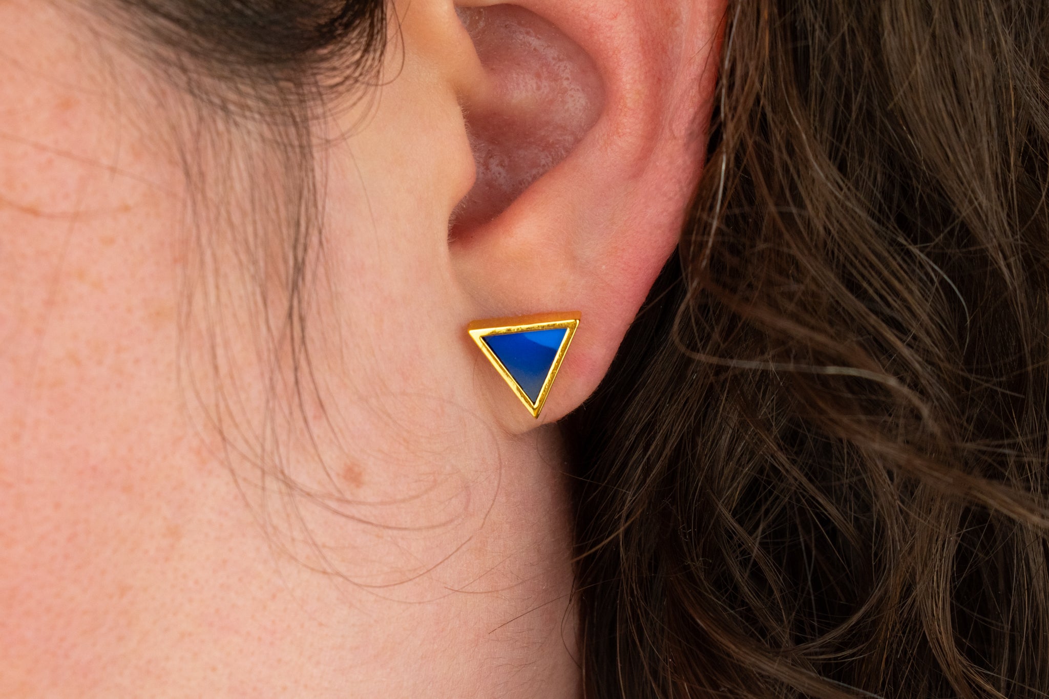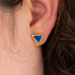 These gold triangle stud earrings are the perfect pairing of elegance and playfulness. Featuring a thick, durable layer of 14k gold alongside hand-marbled, colorful clay meant to mimic gemstone, these studs are lightweight and will make a statement piece. Each item is individually handmade, so slight variations will occur from piece to piece - that's the magic of these unique studs!