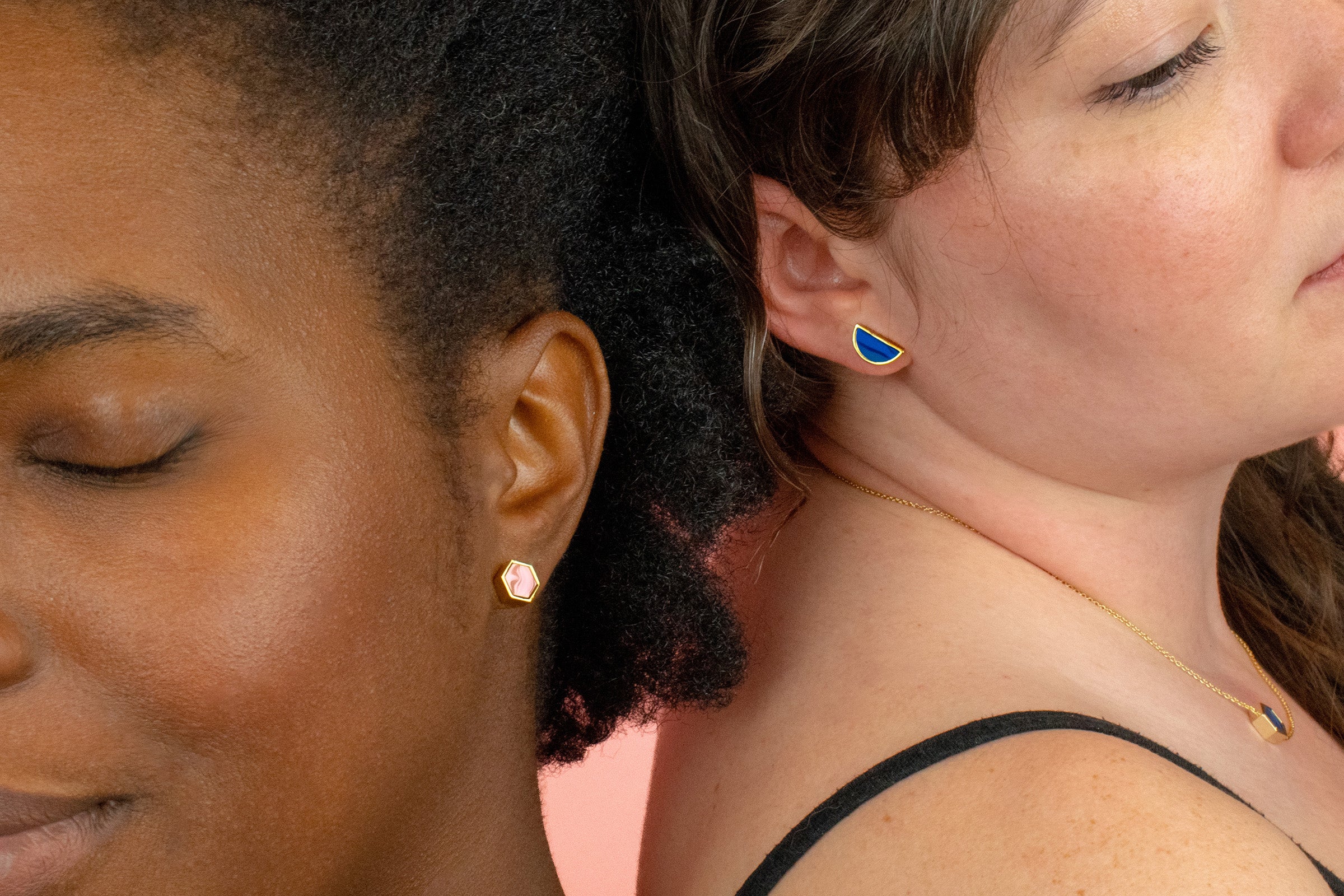 Cleaning: If desired, polish your Geo Studs with a microfiber cloth for extra shine. Note that you should stay away from using jewelry cleaners or harsh chemicals, as they could wear away the gold-plated finish.