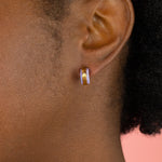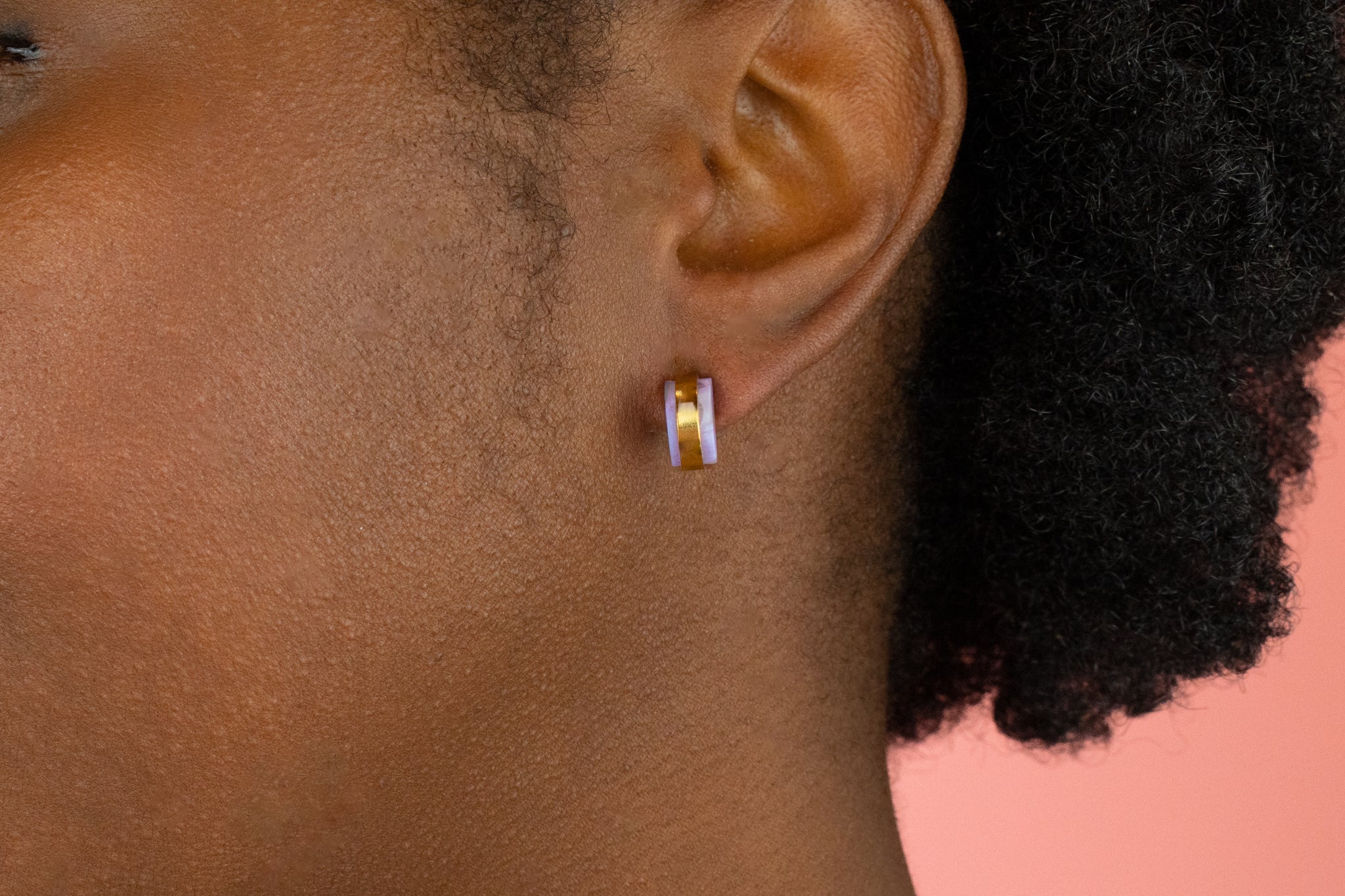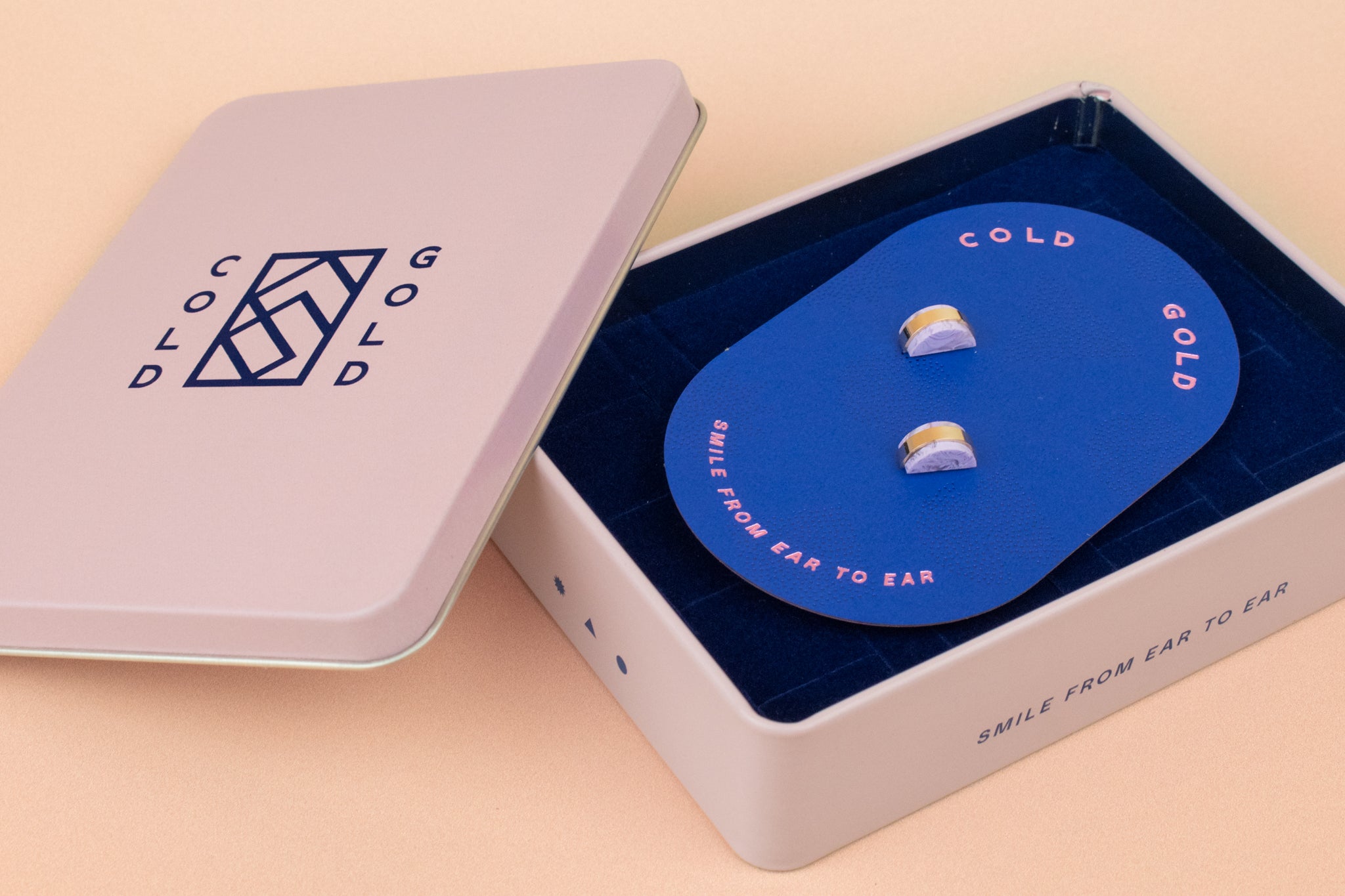 Gaze into the crystal depths + see fashion in your future: the Studio Studs will accompany you across both space and time to the furthest reaches of style. An architectural, 3D take on the classic Cold Gold Geo Stud, the Studio Stud is small in size but big on impact, making it the perfect no-fuss statement earring. A profile view shows off the intricate detail of gemstone-esque semi-transparent clay and a front view highlights the shining 24k gold plated brass half-moon with peeks of color on either side. Finished with surgical steel posts and rubber backings, these lightweight studs are well suited to even the most sensitive ears.