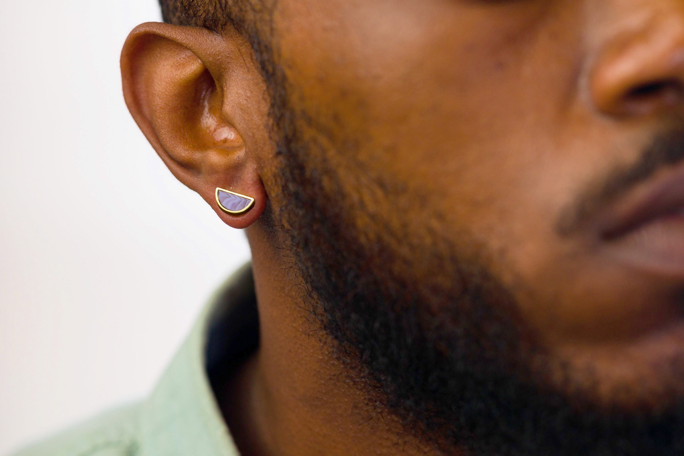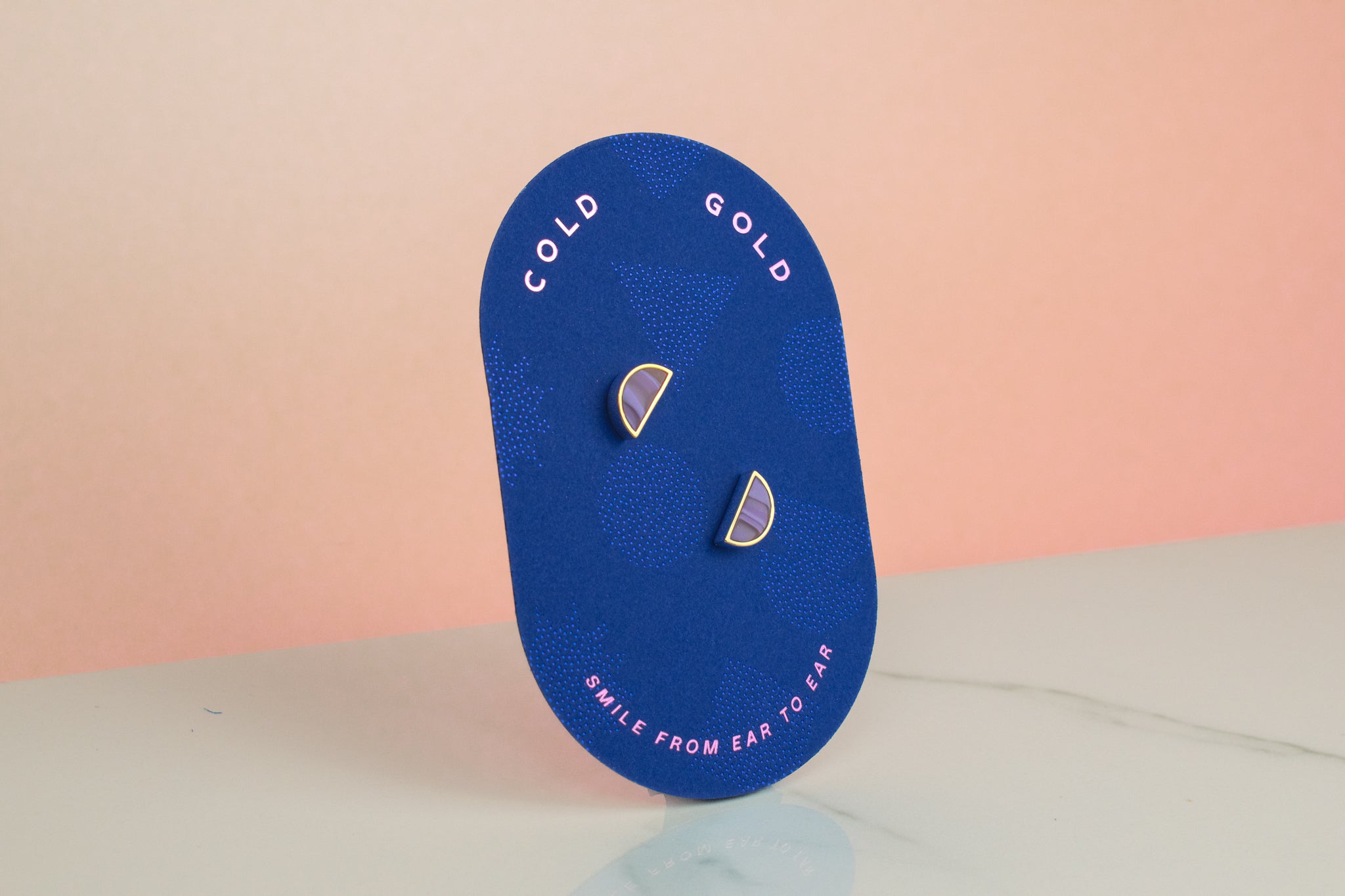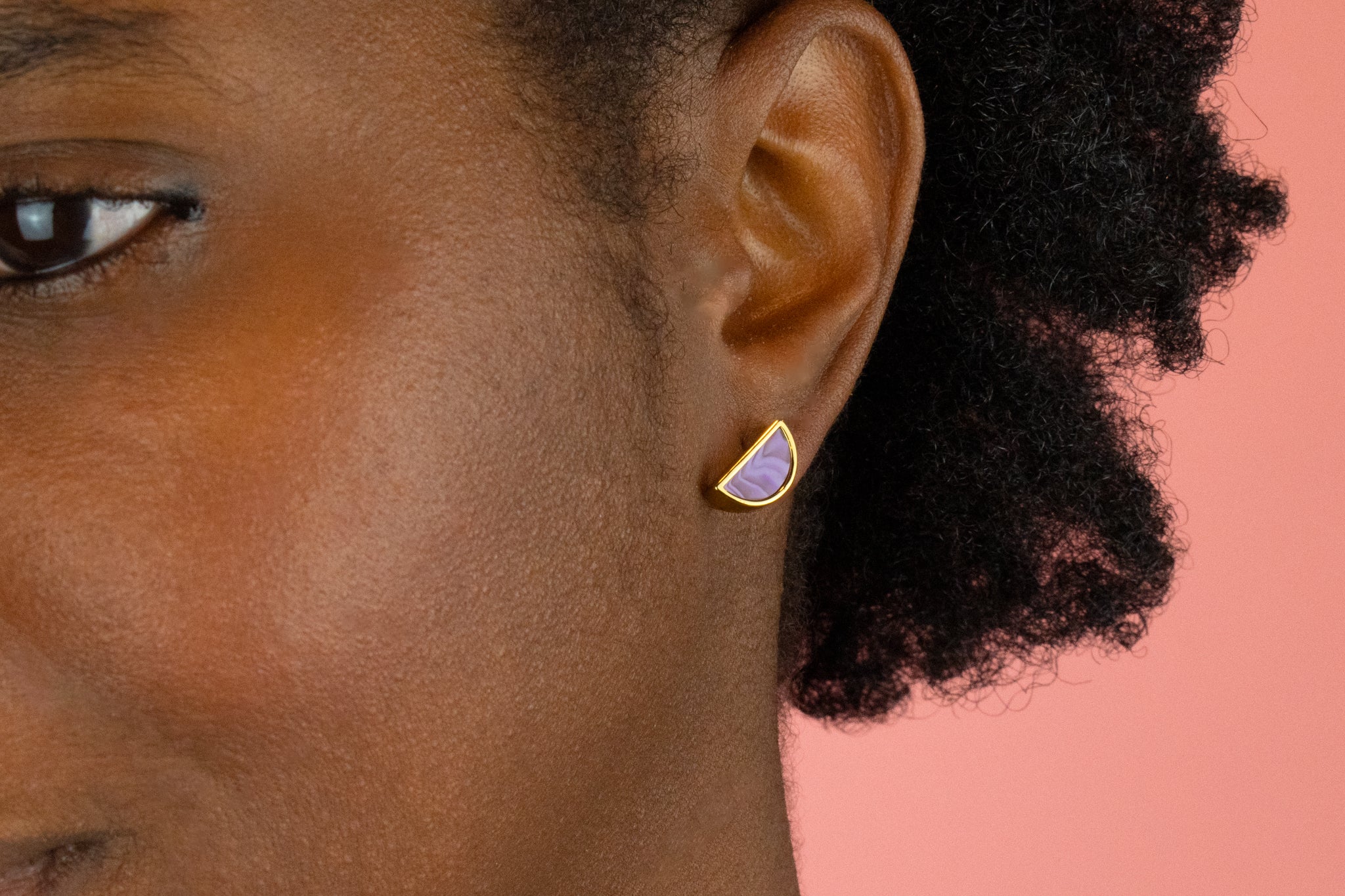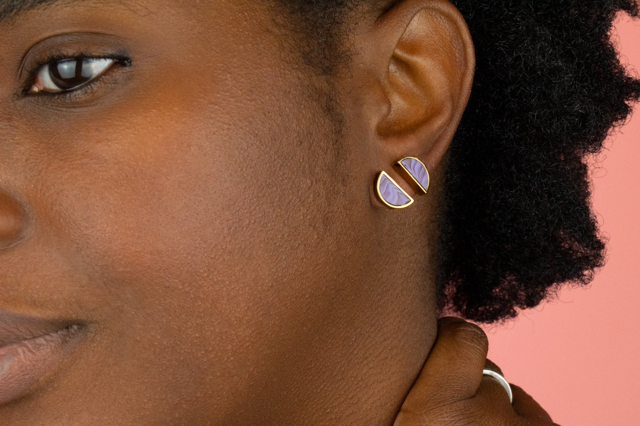 Geometric Stud Earring Set with Amethyst Clay and 14k Gold Half Moons