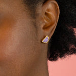 Equal parts royal and sensual, these gold geometric earrings in amethyst clay will add polish to your favorite 'fit. Deep lavender and swirls of transparent lilac clay are marbled to look like real gemstone.