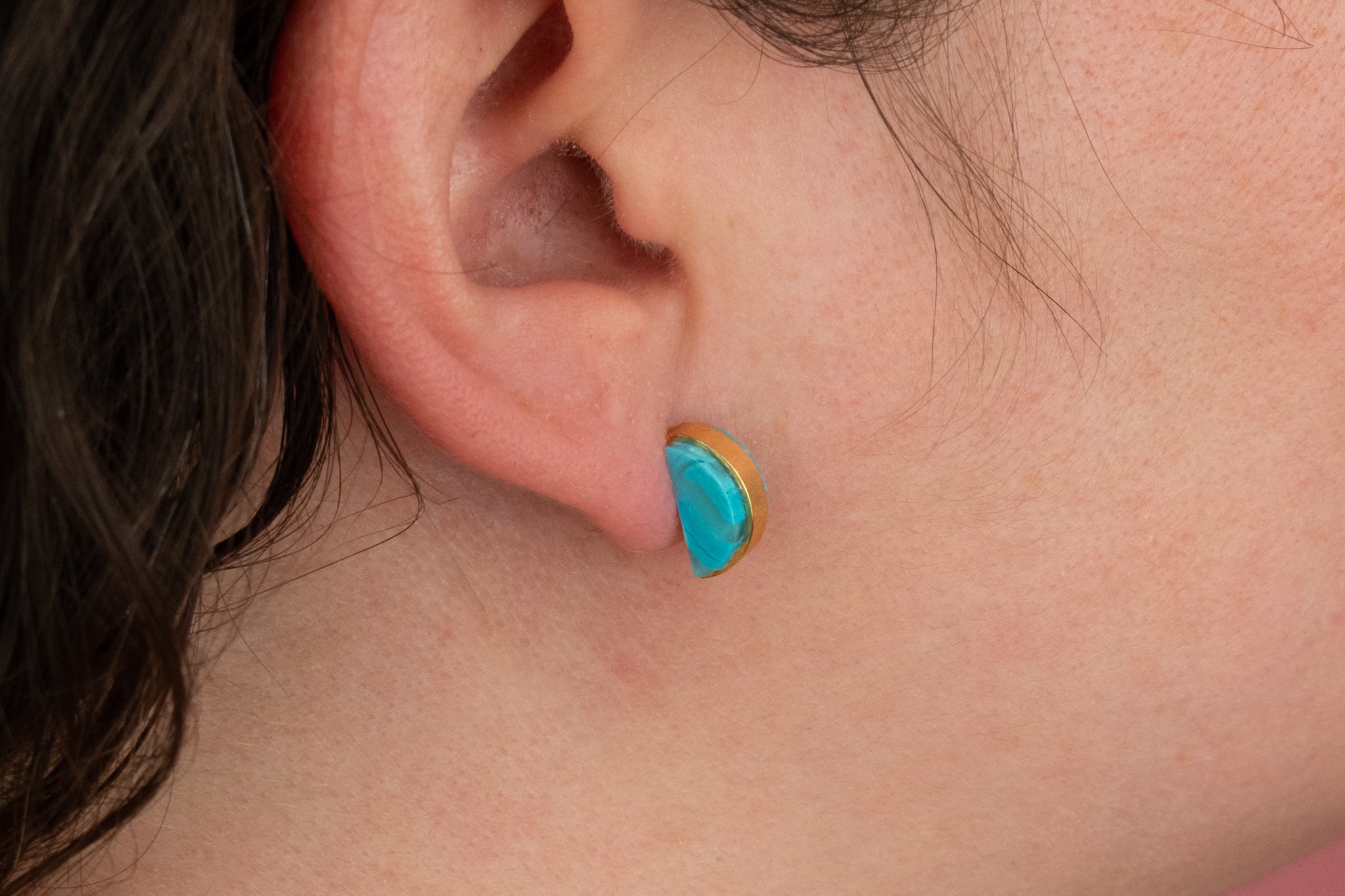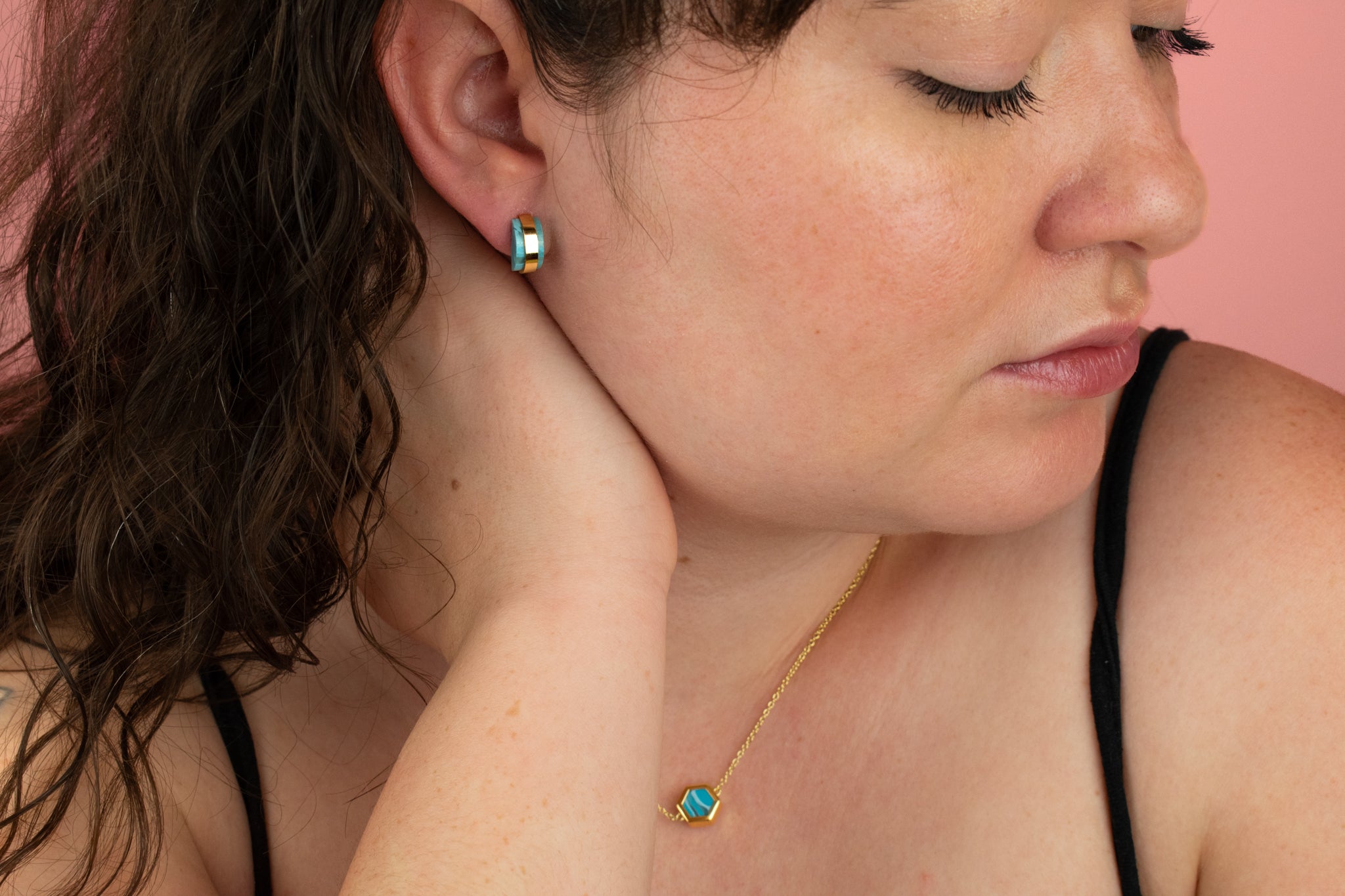 Gaze into the crystal depths + see fashion in your future: the Studio Studs will accompany you across both space and time to the furthest reaches of style. An architectural, 3D take on the classic Cold Gold Geo Stud, the Studio Stud is small in size but big on impact, making it the perfect no-fuss statement earring. A profile view shows off the intricate detail of gemstone-esque semi-transparent clay and a front view highlights the shining 24k gold plated brass half-moon with peeks of color on either side. Finished with surgical steel posts and rubber backings, these lightweight studs are well suited to even the most sensitive ears.