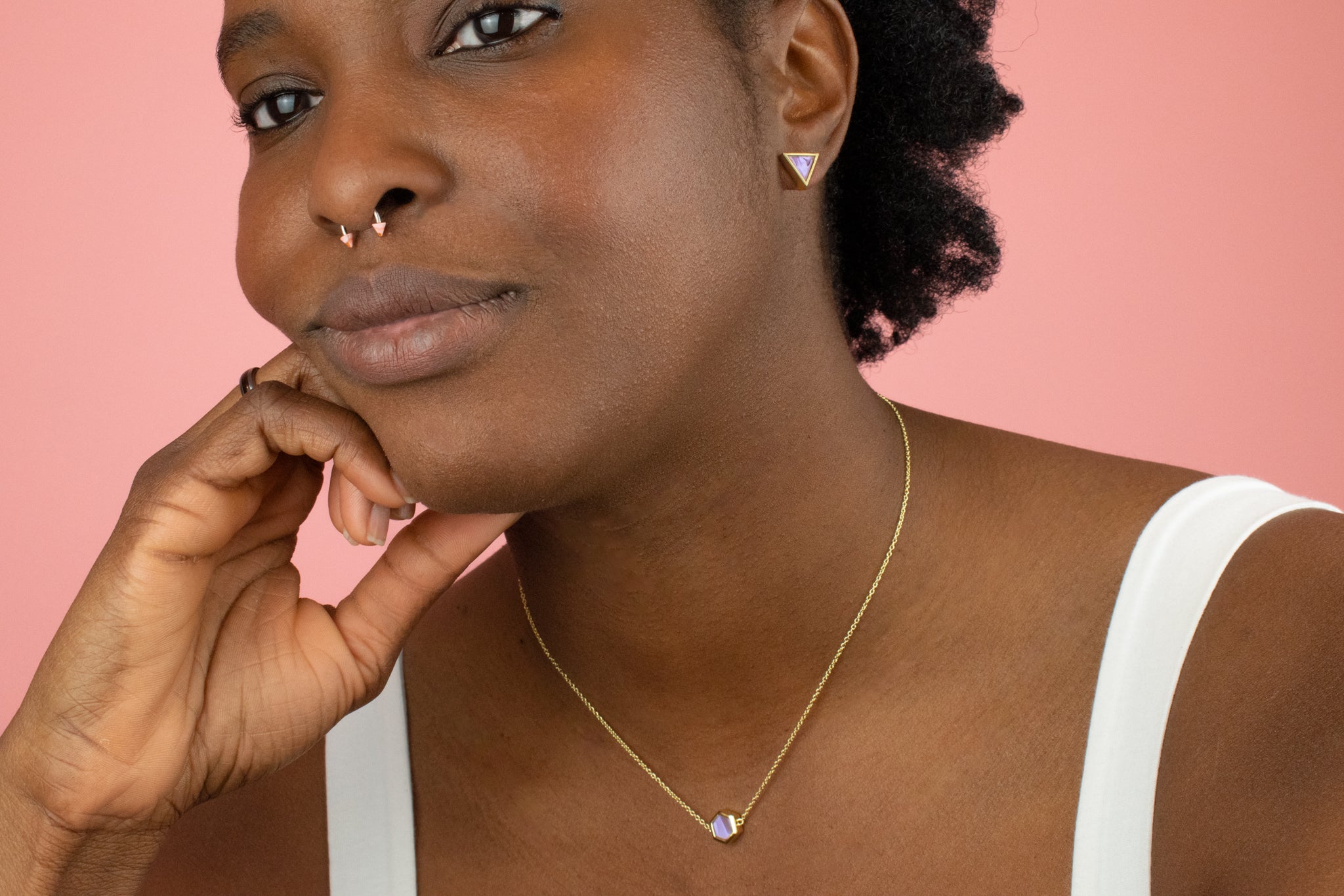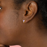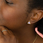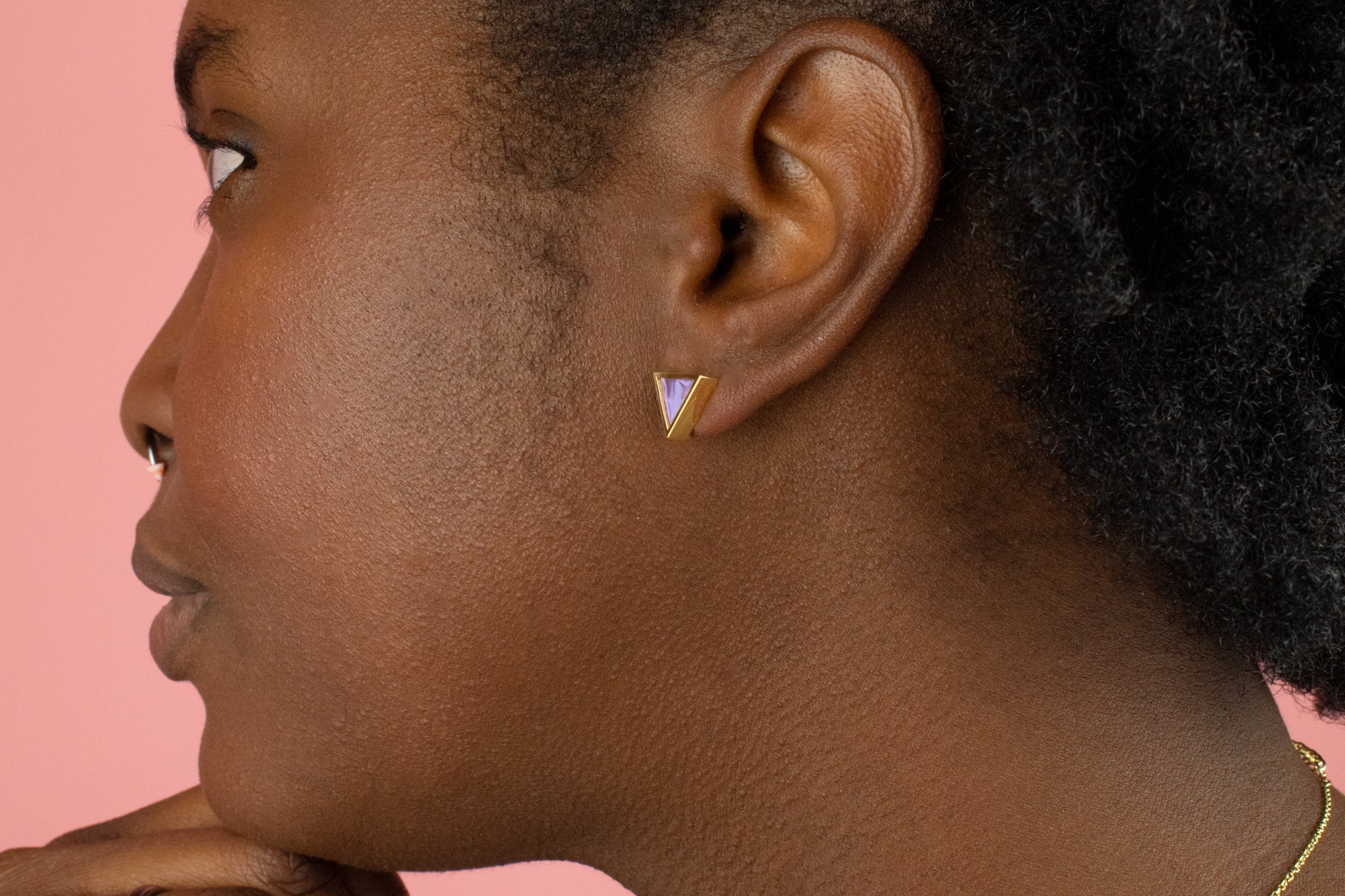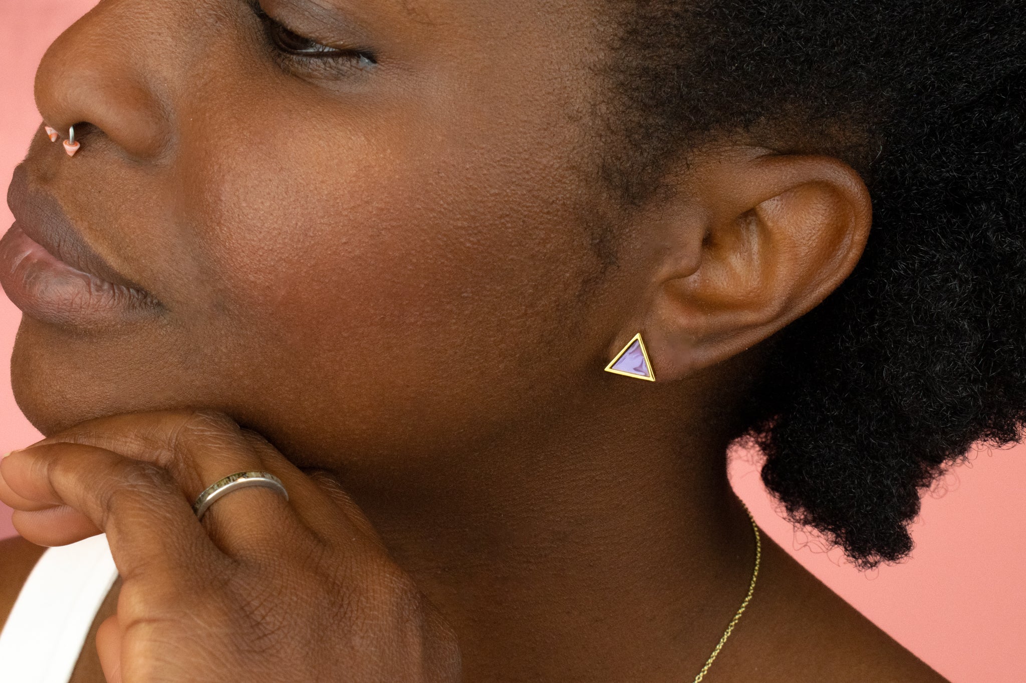 These gold triangle stud earrings are the perfect pairing of elegance and playfulness. Featuring a thick, durable layer of 14k gold alongside hand-marbled, colorful clay meant to mimic gemstone, these studs are lightweight and will make a statement piece. Each item is individually handmade, so slight variations will occur from piece to piece - that's the magic of these unique studs!