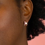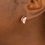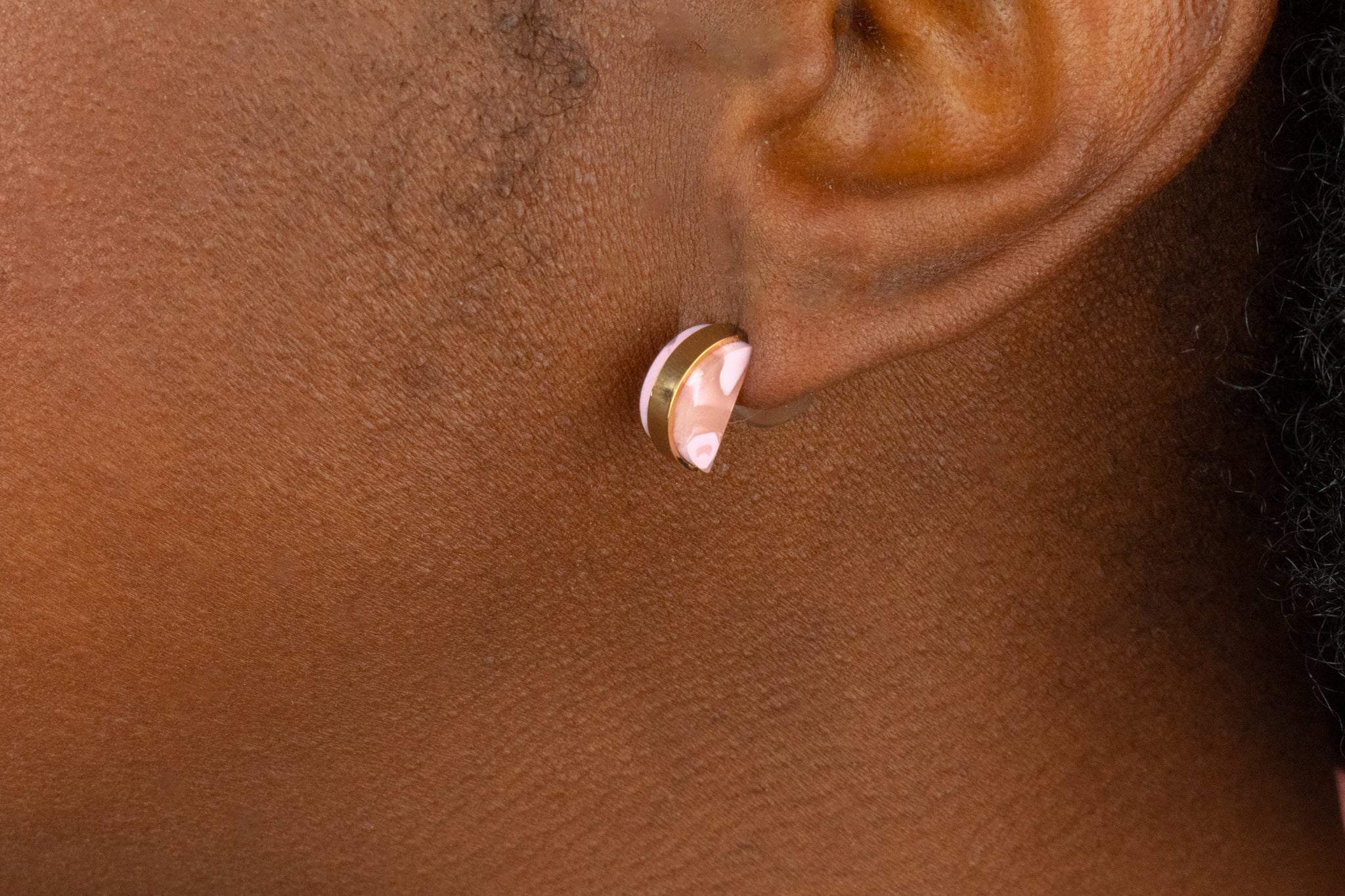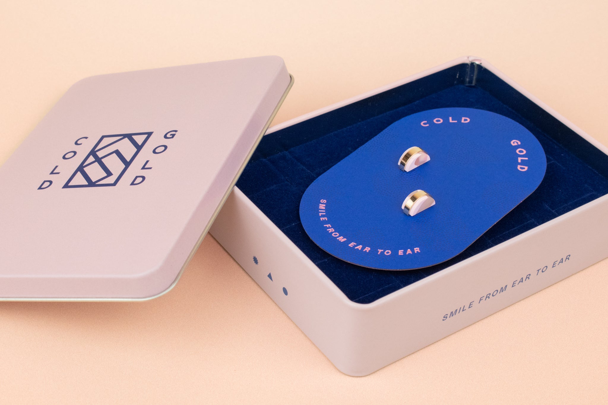 Gaze into the crystal depths + see fashion in your future: the Studio Studs will accompany you across both space and time to the furthest reaches of style. An architectural, 3D take on the classic Cold Gold Geo Stud, the Studio Stud is small in size but big on impact, making it the perfect no-fuss statement earring. A profile view shows off the intricate detail of gemstone-esque semi-transparent clay and a front view highlights the shining 24k gold plated brass half-moon with peeks of color on either side. Finished with surgical steel posts and rubber backings, these lightweight studs are well suited to even the most sensitive ears.