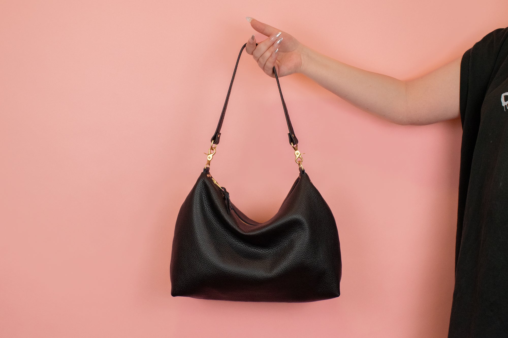 For a slouchy crescent handbag: Detach the shoulder strap. Connect the swivel clasp atop your handbag to the polished brass loop. The connected hardware becomes your handle, meant to carry at your side.