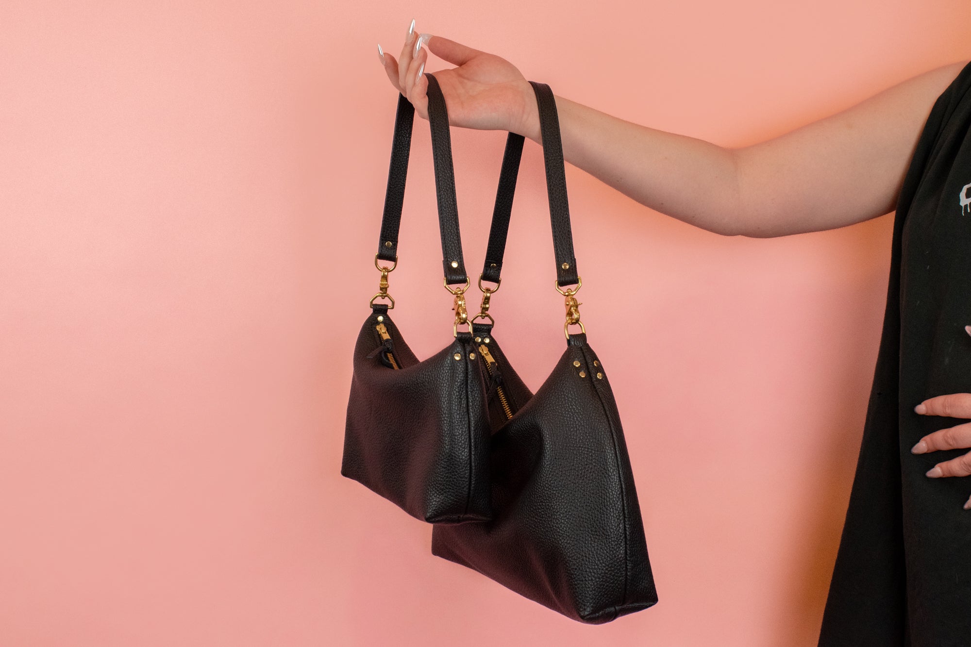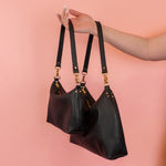 If you know us, you know we design our leather goods to be just as functional as they are cute. This convertible leather handbag's multi-functional hardware lets you style it several ways: as a leather shoulder bag, as a mini crescent bag, and as a looped wristlet. All three styles are guaranteed to impress the fashion girlies. (See our Style Guide section for a detailed How-To.)