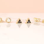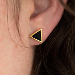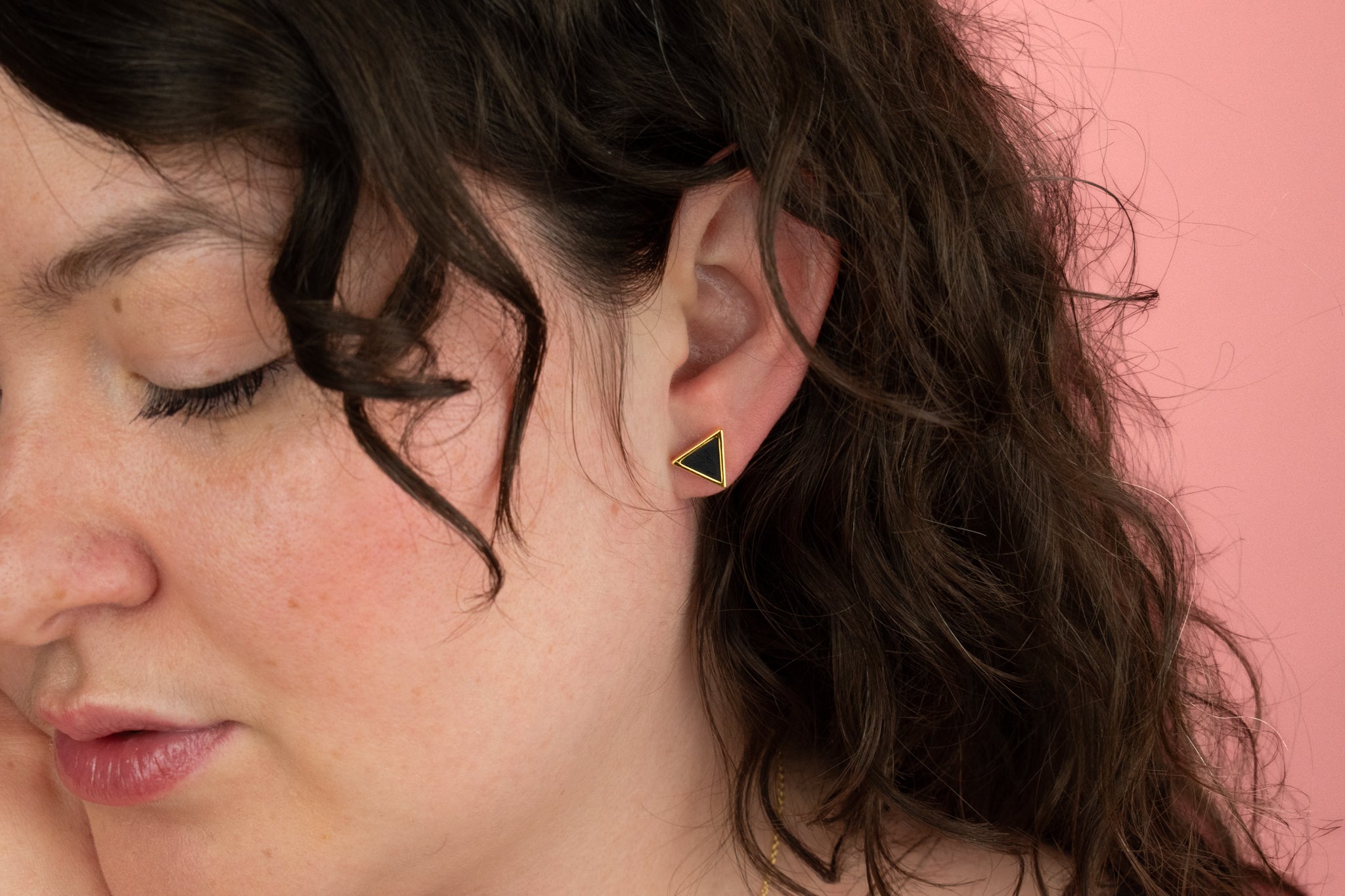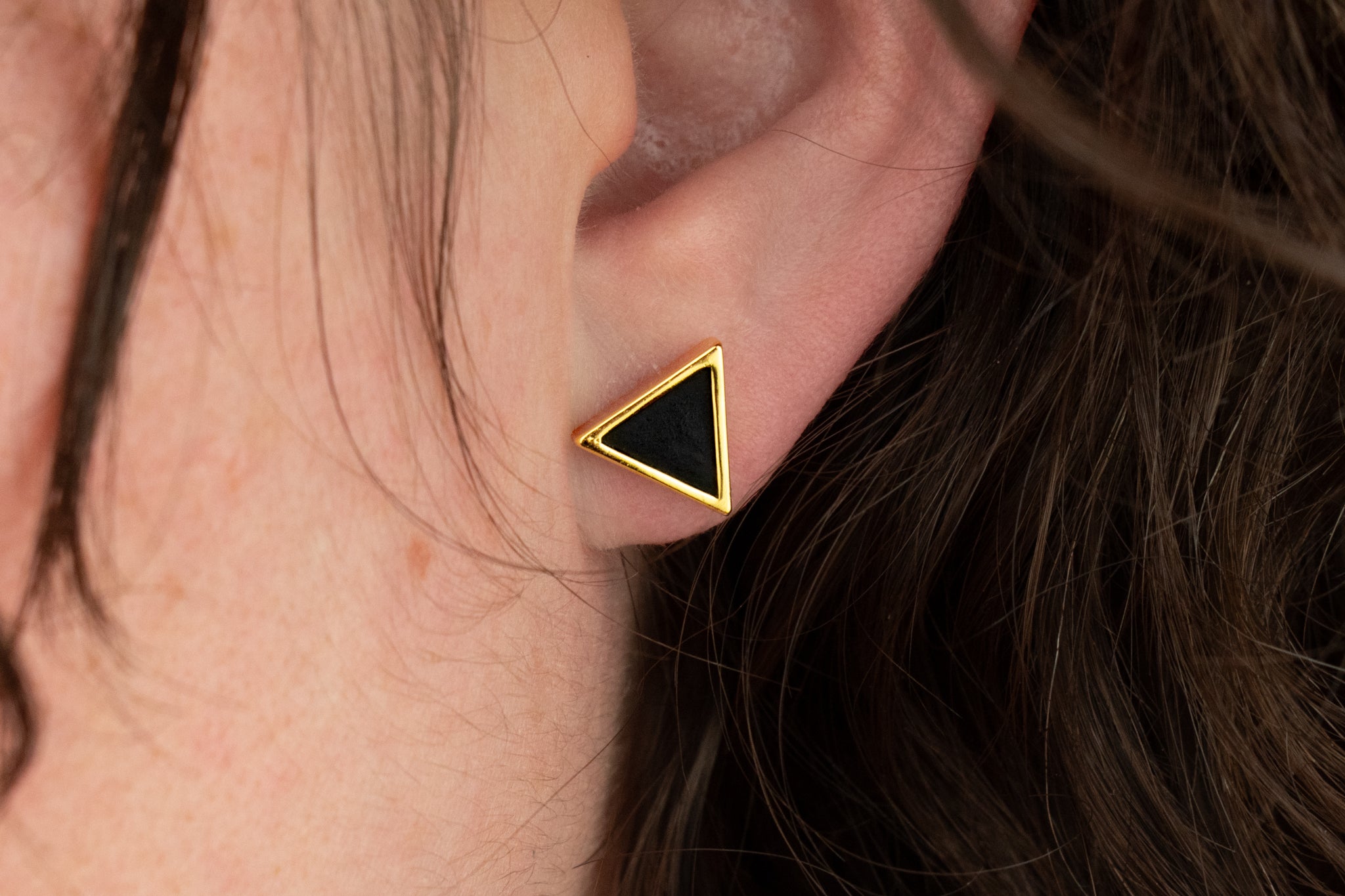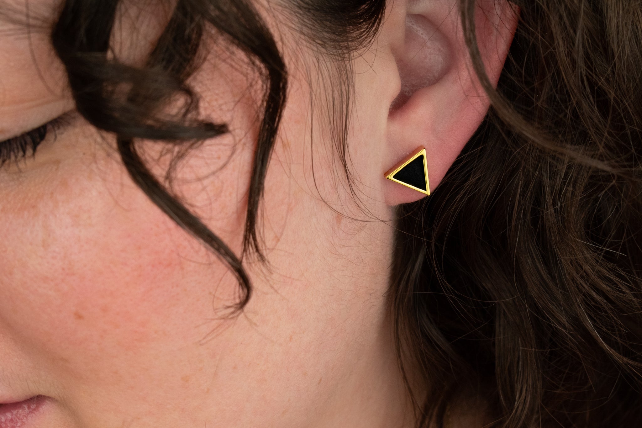 Estos aretes triangulares dorados son la combinación perfecta de elegancia y alegría. Con una capa gruesa y duradera de oro de 14k junto con arcilla negra, estos aretes son livianos y serán una pieza llamativa. Cada artículo está hecho a mano individualmente, por lo que se producirán ligeras variaciones de una pieza a otra. ¡Esa es la magia de estos pendientes únicos!