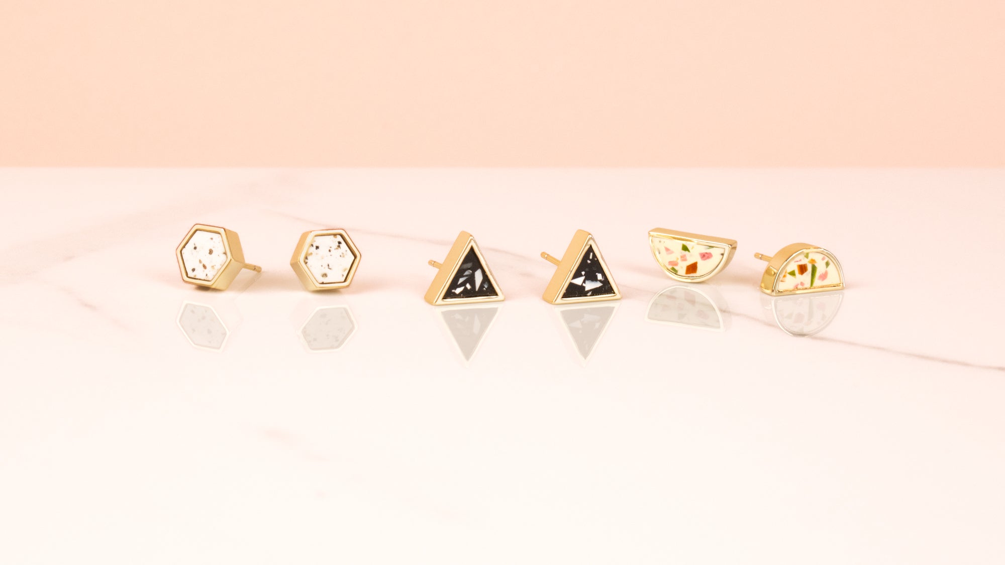Limpieza: Si lo deseas, pule tus Geo Studs con un paño de microfibra para obtener mayor brillo. Tenga en cuenta que debe evitar el uso de limpiadores de joyas o productos químicos agresivos, ya que podrían desgastar el acabado chapado en oro.