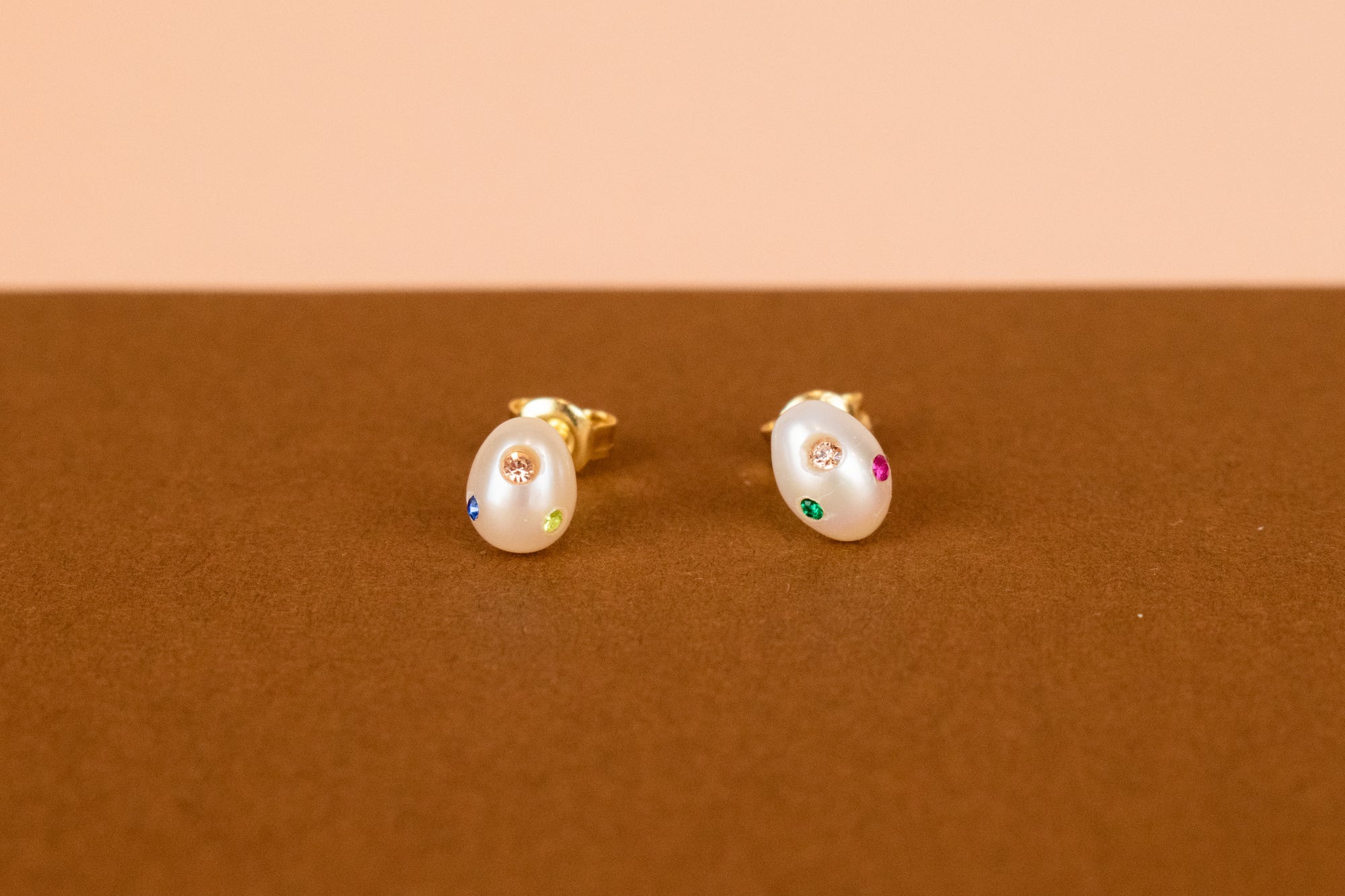 The Aura Studs: aretes de piedras preciosas arcoíris y perlas doradas