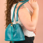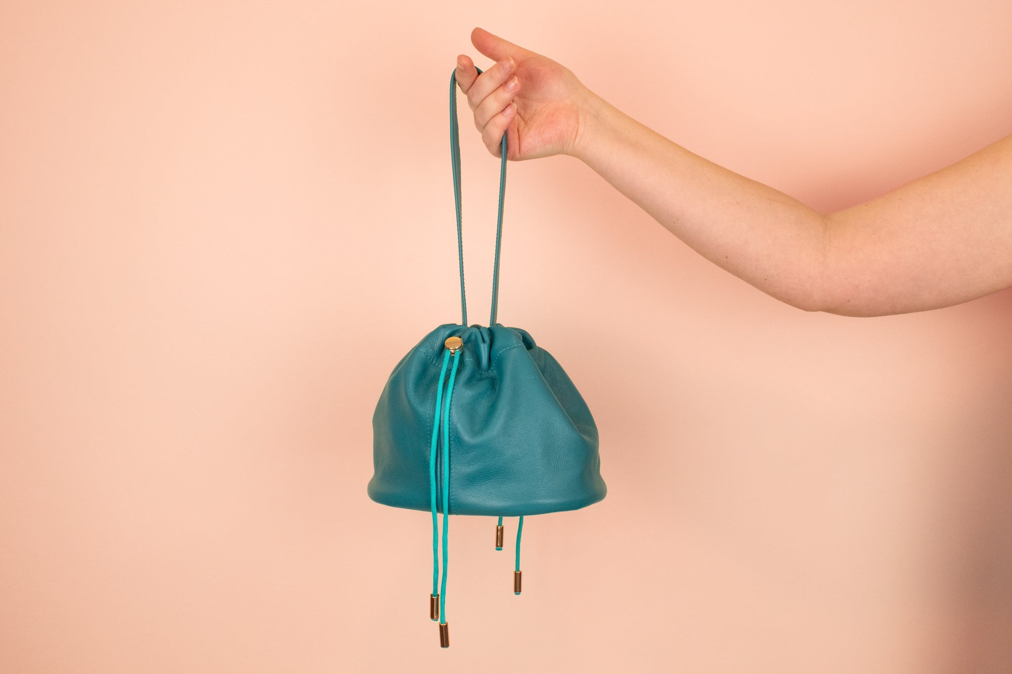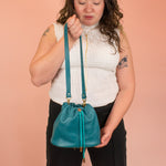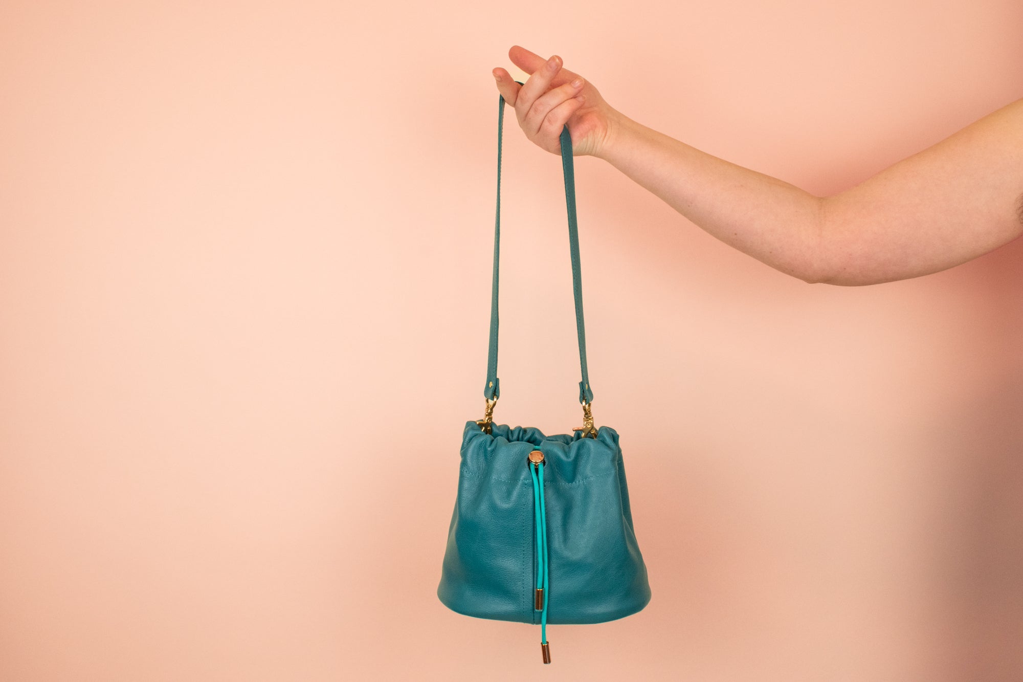 Pour un look bracelet plus court : connectez les deux fermoirs du bracelet en laiton massif à la boucle en laiton à la base intérieure du sac à main. Nous adorons ce look avec les cordons de serrage bien serrés autour de la sangle.