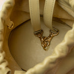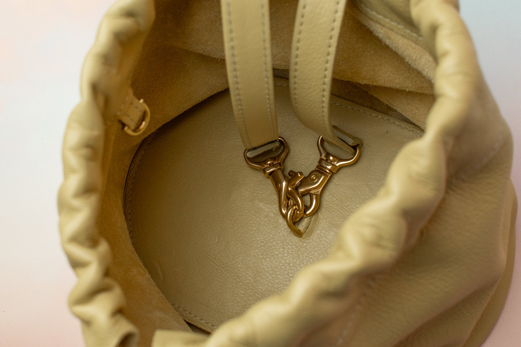 Ce sac Duo comprend : 1 sac seau à cordon en cuir et 1 bandoulière amovible avec détails en laiton massif.