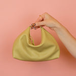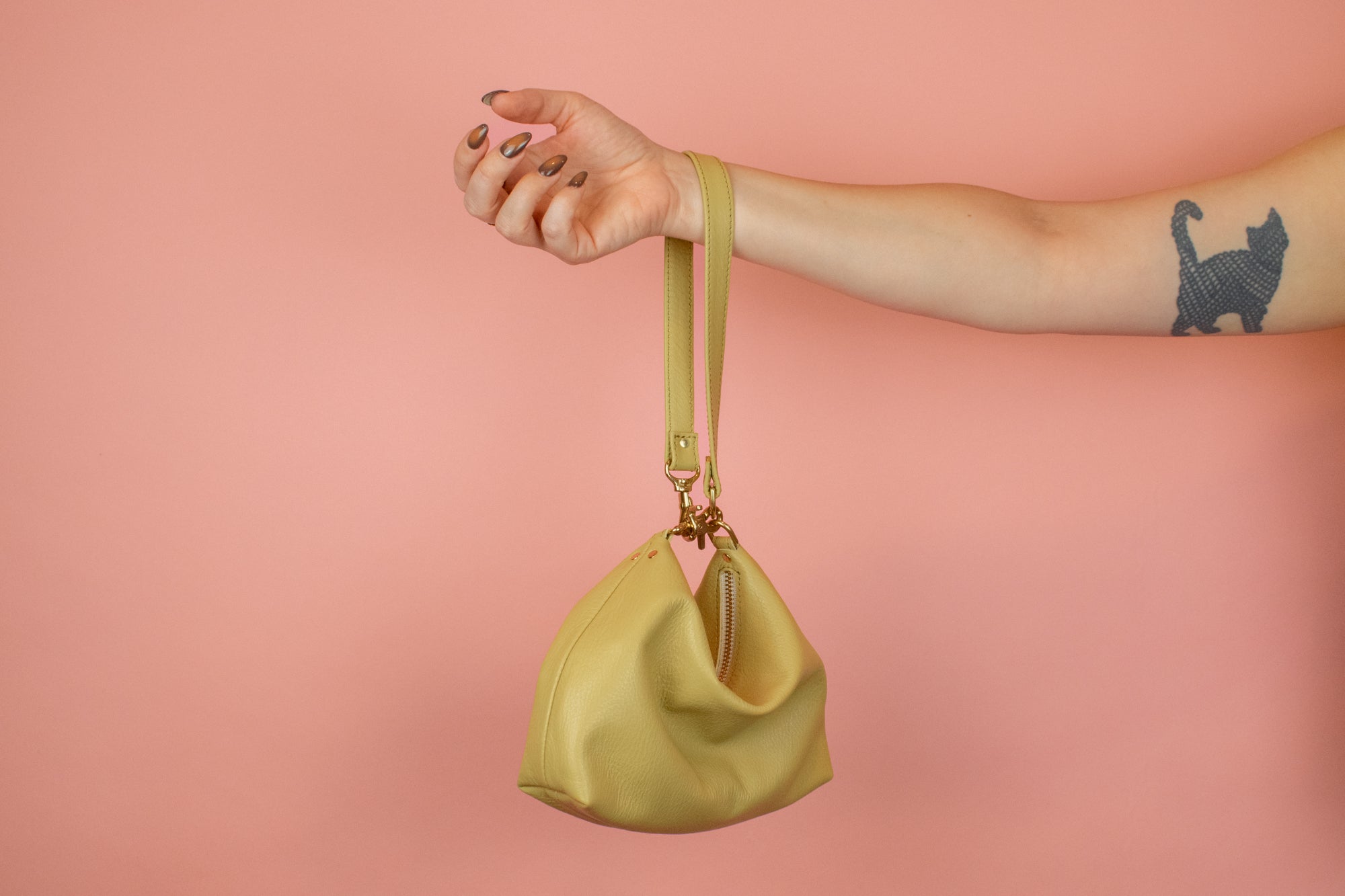 For a slouchy mini handbag: Connect the hardware at the top of your handbag in the middle over the zipper. The connected hardware becomes your purse handle, meant to carry at your side or as a wristlet.