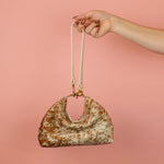 For a crescent shaped wristlet: Connect the hardware at the top of your handbag in the middle over the zipper. Then connect the detachable strap to the middle hardware.