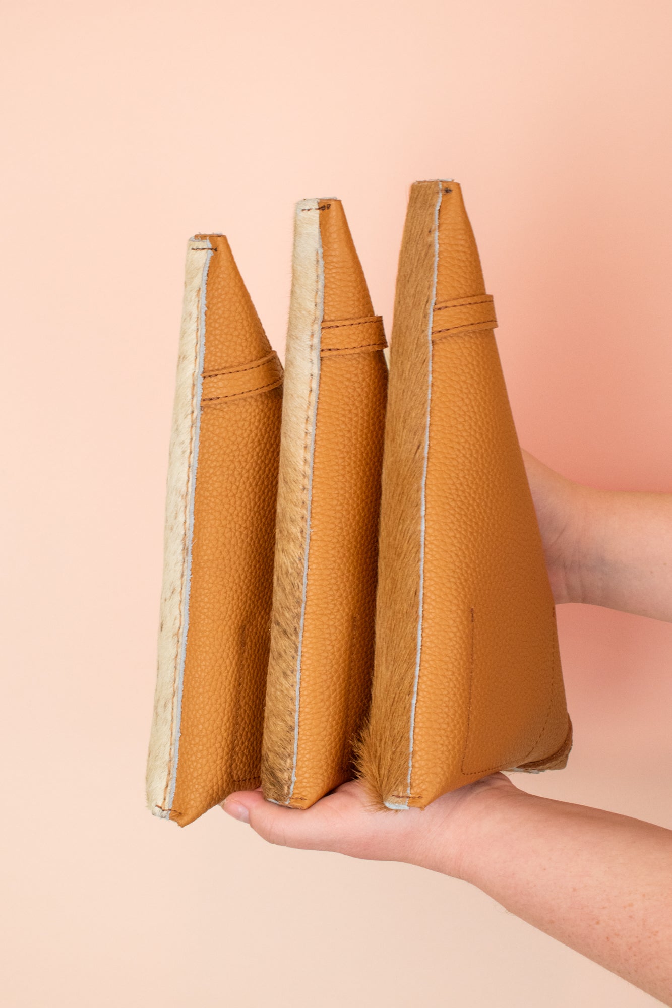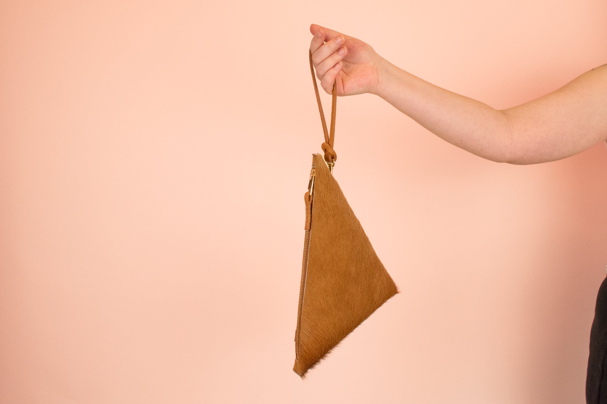 Le TriSling : un sac à bandoulière en cuir / une pochette à bracelet en cuir châtain avec poils sur peau
