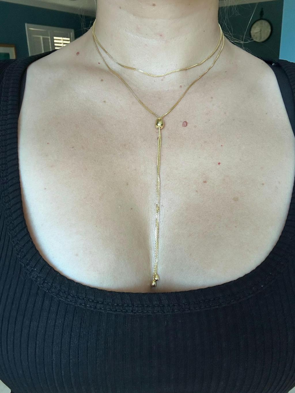 The adjustable slider bead paired with a thin box chain allows you to customize the length and fit, ensuring it complements any neckline and occasion. Whether you prefer a choker style, a longer, dramatic drape, a traditional, western bolo, or a layered look this necklace transforms to match your outfit and mood. The dainty, gold pendant drops are weighted to add the perfect drape and a refined finish. Ideal for layering with other necklaces or making a statement on its own, this versatile piece adapts to any occasion. Slide it. Wrap it. Double it. Tie it. The possibilities are infinite.
