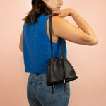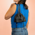 Not only is it large enough to fit your wallet, phone, sunglasses, and lots of accessories, this leather bucket bag has a drawstring and clasped strap so you can wear it lots of ways. In fact, that’s why we call it Duo! Our two strap settings allow for you to wear it shorter as a chic wristlet or wear it as a slouchy shoulder bag. This sporty bucket bag is finished with color-coordinating stitching, high-quality paracord drawstrings, and golden cord ends and cord slider. We even edge paint the strap so it’s polished and perfect. This drawstring bag is perfect when you don’t want to pack both a day tote AND a date night bag on vacation. Cold Gold has become known for its versatility, and the Duo bag in black leather is no exception.