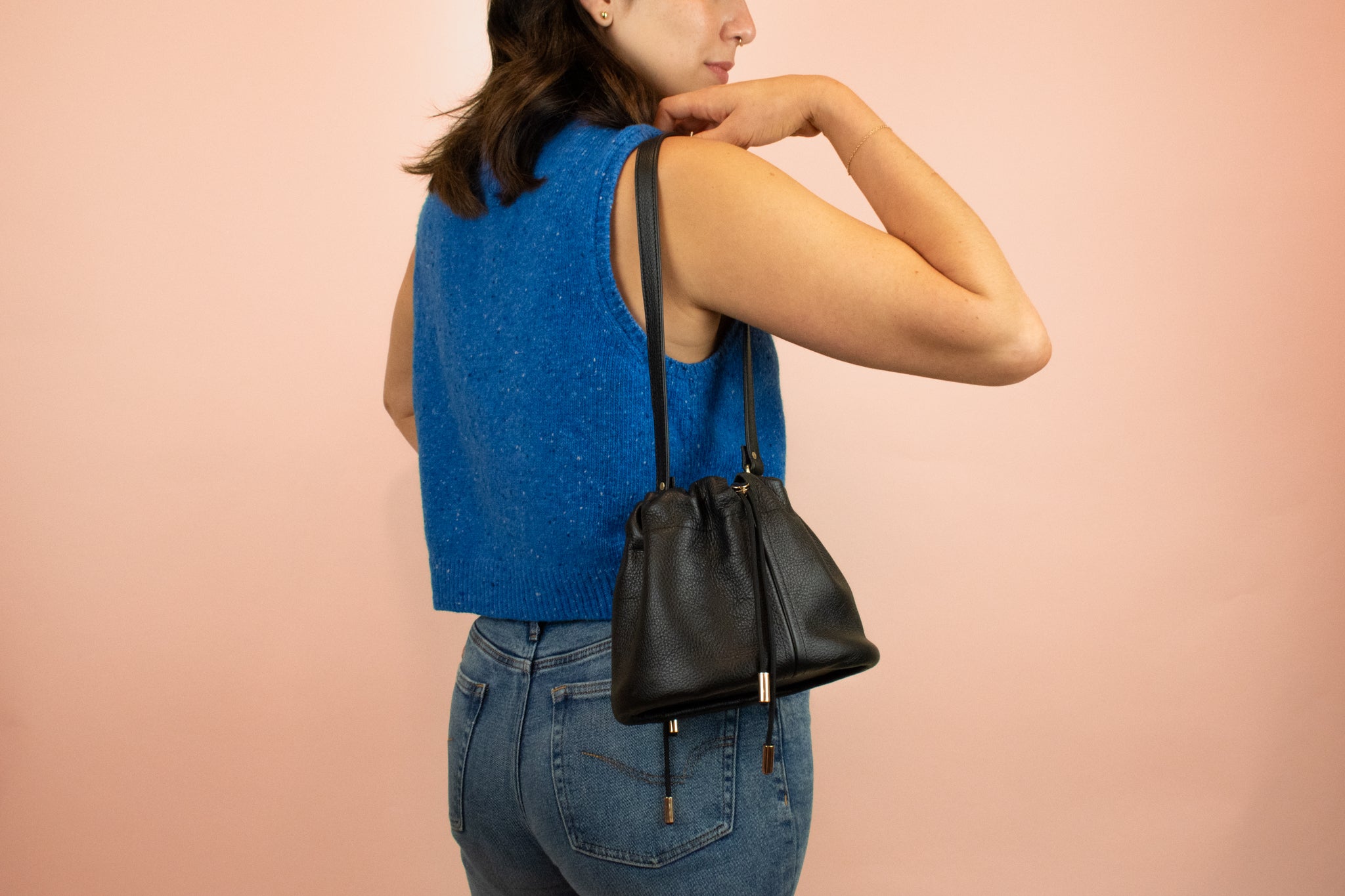 For a longer, shoulder bag look: Connect the strap ends to the set of brass loops located on each side of the bag. We love to let the drawstrings out a bit for a slouchy look.